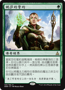 | Rules | When Oath of Nissa enters the battlefield, look at the top three cards of your library. You may reveal a creature, land, or planeswalker card from among them and put it into your hand. Put the rest on the bottom of your library in any order. You may spend mana as though it were mana of any color to cast planeswalker spells. |