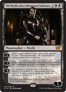 | Rules | +2: Each opponent loses 1 life. You gain life equal to the life lost this way. −2: Create a 5/5 black Demon creature token with flying. You lose 2 life. −8: You get an emblem with ", Sacrifice a creature: You gain X life and draw X cards, where X is the sacrificed creature's power." Ob Nixilis of the Black Oath can be your commander. |