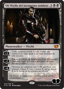| Rules | +2: Each opponent loses 1 life. You gain life equal to the life lost this way. −2: Create a 5/5 black Demon creature token with flying. You lose 2 life. −8: You get an emblem with ", Sacrifice a creature: You gain X life and draw X cards, where X is the sacrificed creature's power." Ob Nixilis of the Black Oath can be your commander. |