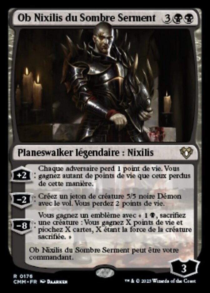 | Rules | +2: Each opponent loses 1 life. You gain life equal to the life lost this way. −2: Create a 5/5 black Demon creature token with flying. You lose 2 life. −8: You get an emblem with ", Sacrifice a creature: You gain X life and draw X cards, where X is the sacrificed creature's power." Ob Nixilis of the Black Oath can be your commander. |