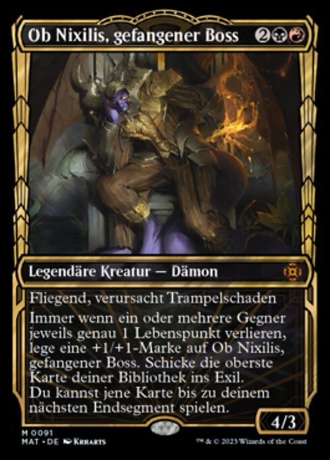 | Rules | Flying, trample Whenever one or more opponents each lose exactly 1 life, put a +1/+1 counter on Ob Nixilis, Captive Kingpin. Exile the top card of your library. Until your next end step, you may play that card. |