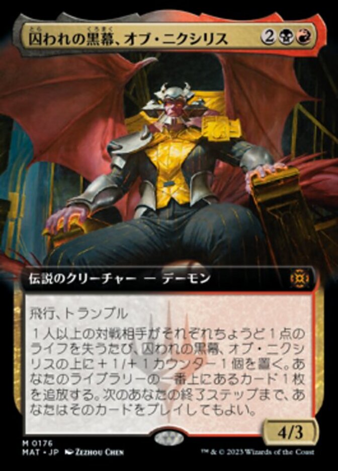| Rules | Flying, trample Whenever one or more opponents each lose exactly 1 life, put a +1/+1 counter on Ob Nixilis, Captive Kingpin. Exile the top card of your library. Until your next end step, you may play that card. |