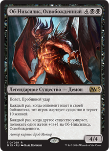| Rules | Flying, trample Whenever an opponent searches their library, that player sacrifices a creature and loses 10 life. Whenever another creature dies, put a +1/+1 counter on Ob Nixilis, Unshackled. |