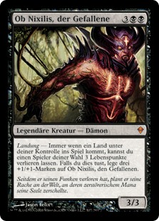 | Rules | Landfall — Whenever a land enters the battlefield under your control, you may have target player lose 3 life. If you do, put three +1/+1 counters on Ob Nixilis, the Fallen. |