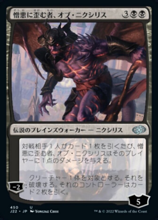 | Rules | Whenever an opponent draws a card, Ob Nixilis, the Hate-Twisted deals 1 damage to that player. −2: Destroy target creature. Its controller draws two cards. |