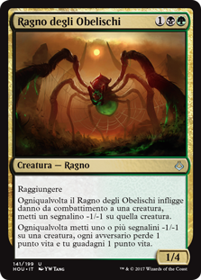 | Rules | Reach Whenever Obelisk Spider deals combat damage to a creature, put a -1/-1 counter on that creature. Whenever you put one or more -1/-1 counters on a creature, each opponent loses 1 life and you gain 1 life. |