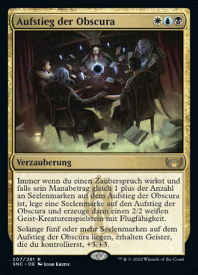 | Rules | Whenever you cast a spell, if its mana value is equal to 1 plus the number of soul counters on Obscura Ascendancy, put a soul counter on Obscura Ascendancy, then create a 2/2 white Spirit creature token with flying. As long as there are five or more soul counters on Obscura Ascendancy, Spirits you control get +3/+3. |