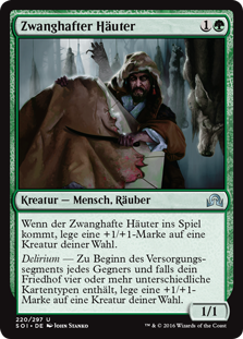 | Rules | When Obsessive Skinner enters the battlefield, put a +1/+1 counter on target creature. Delirium — At the beginning of each opponent's upkeep, if there are four or more card types among cards in your graveyard, put a +1/+1 counter on target creature. |