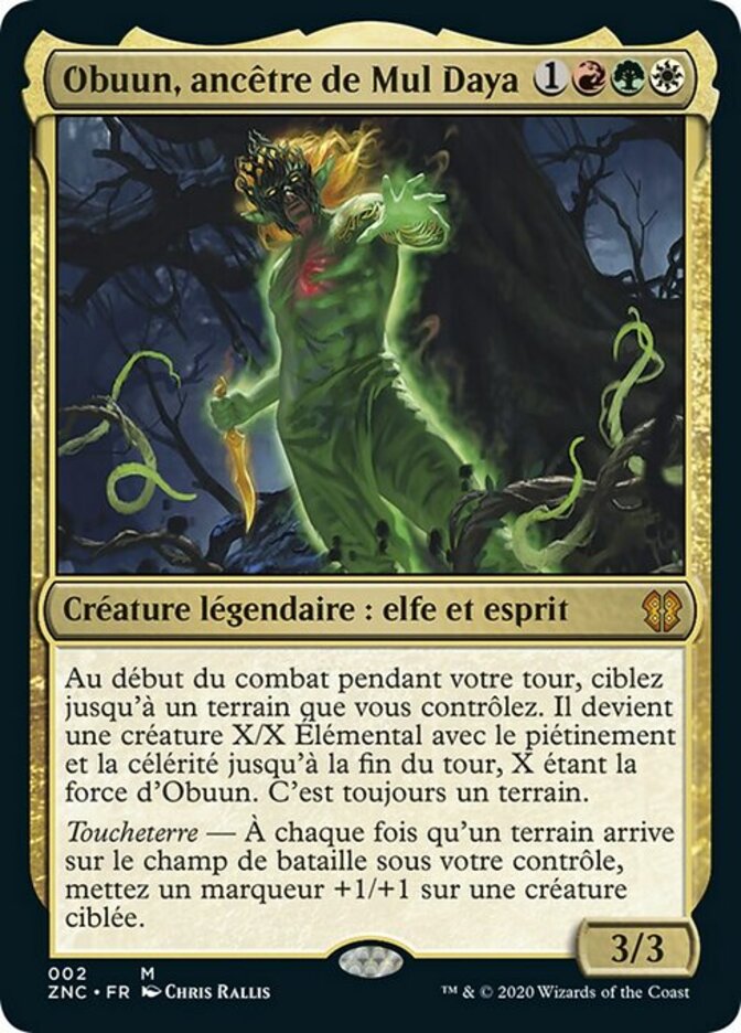 | Rules | At the beginning of combat on your turn, up to one target land you control becomes an X/X Elemental creature with trample and haste until end of turn, where X is Obuun's power. It's still a land. Landfall — Whenever a land enters the battlefield under your control, put a +1/+1 counter on target creature. |