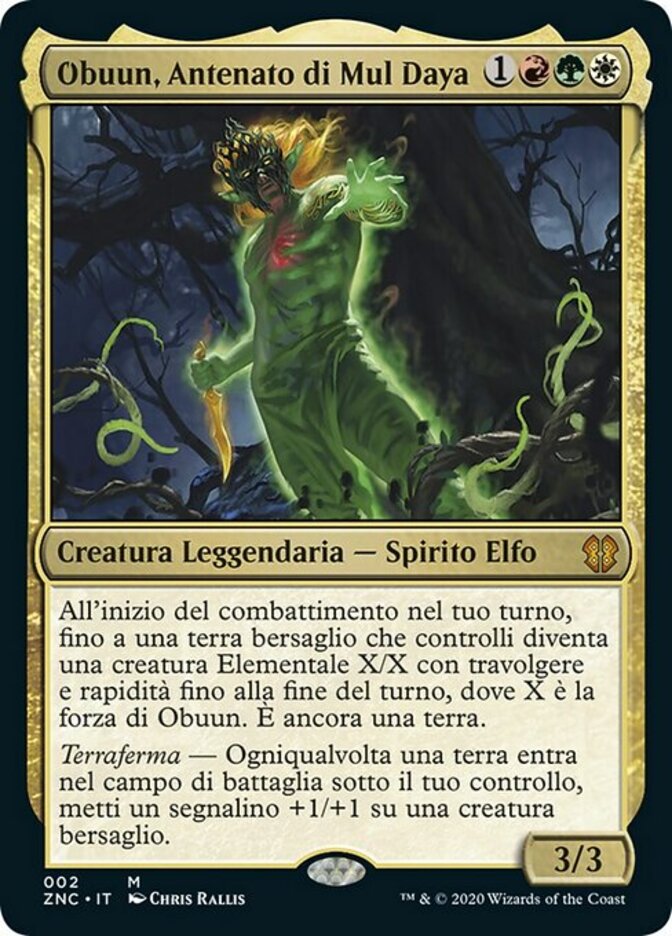 | Rules | At the beginning of combat on your turn, up to one target land you control becomes an X/X Elemental creature with trample and haste until end of turn, where X is Obuun's power. It's still a land. Landfall — Whenever a land enters the battlefield under your control, put a +1/+1 counter on target creature. |