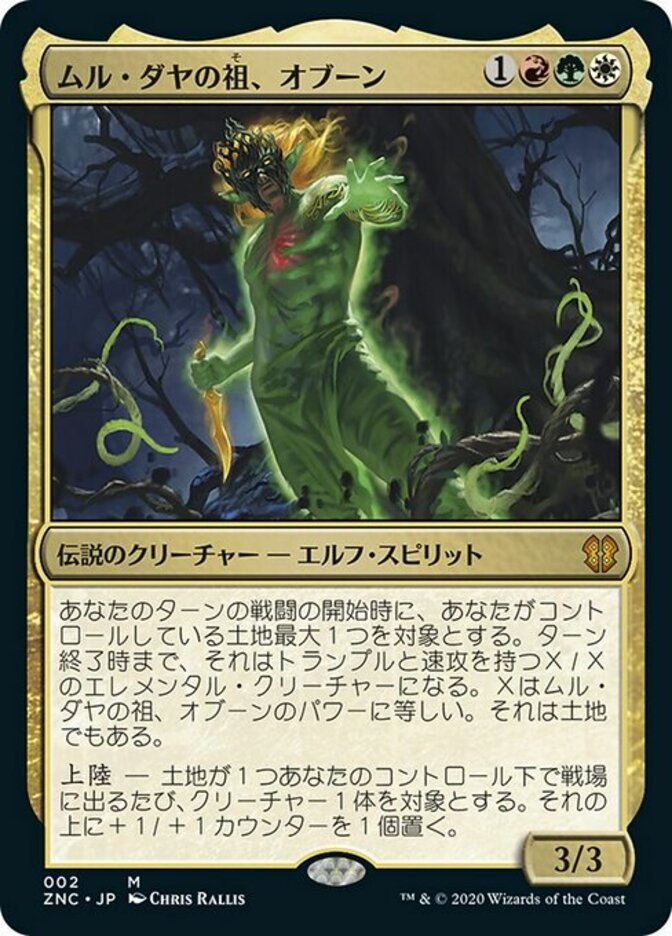 | Rules | At the beginning of combat on your turn, up to one target land you control becomes an X/X Elemental creature with trample and haste until end of turn, where X is Obuun's power. It's still a land. Landfall — Whenever a land enters the battlefield under your control, put a +1/+1 counter on target creature. |