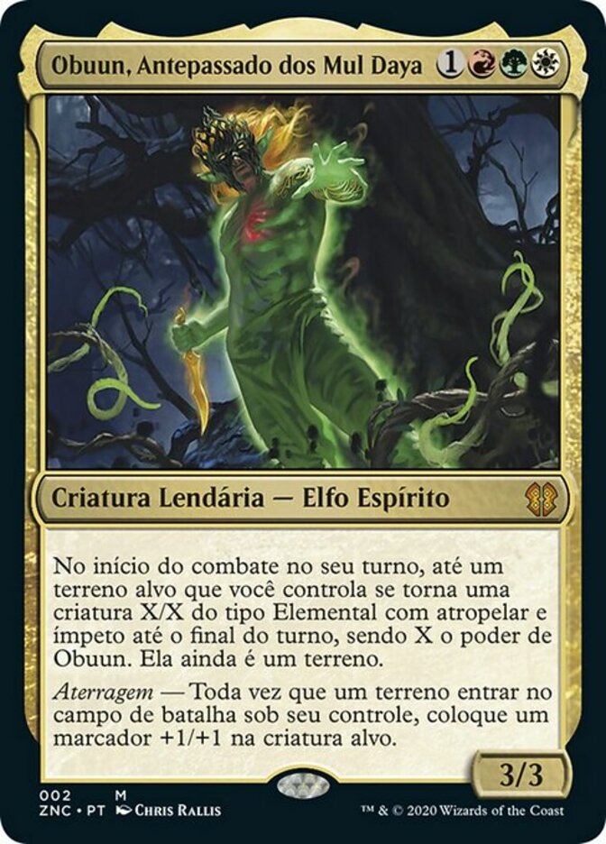 | Rules | At the beginning of combat on your turn, up to one target land you control becomes an X/X Elemental creature with trample and haste until end of turn, where X is Obuun's power. It's still a land. Landfall — Whenever a land enters the battlefield under your control, put a +1/+1 counter on target creature. |