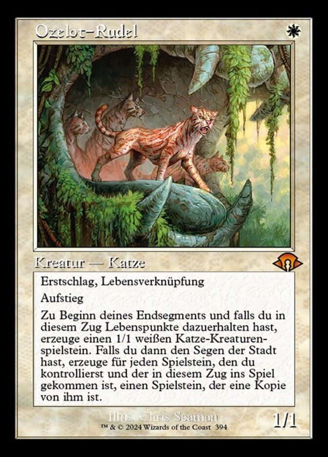 | Rules | First strike, lifelink Ascend (If you control ten or more permanents, you get the city's blessing for the rest of the game.) At the beginning of your end step, if you gained life this turn, create a 1/1 white Cat creature token. Then if you have the city's blessing, for each token you control that entered the battlefield this turn, create a token that's a copy of it. |