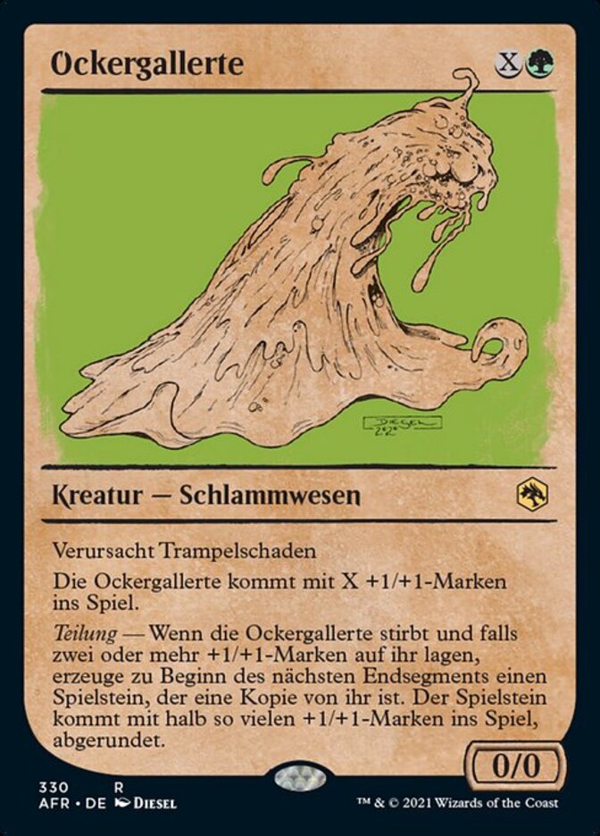 | Rules | Trample Ochre Jelly enters the battlefield with X +1/+1 counters on it. Split — When Ochre Jelly dies, if it had two or more +1/+1 counters on it, create a token that's a copy of it at the beginning of the next end step. The token enters the battlefield with half that many +1/+1 counters on it, rounded down. |