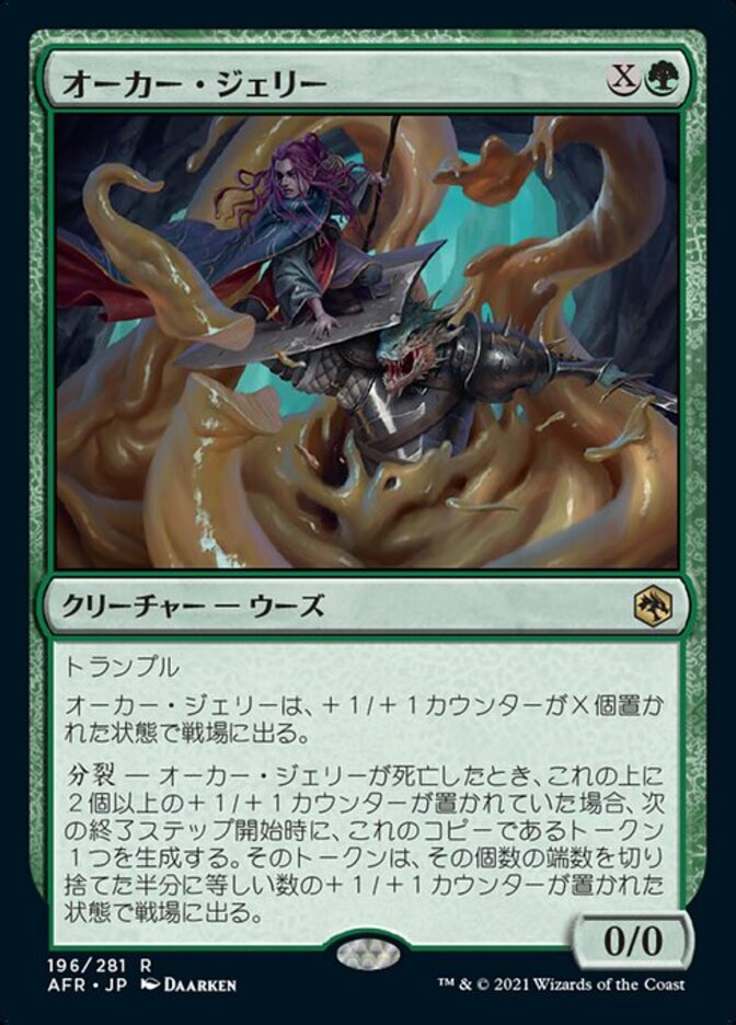 | Rules | Trample Ochre Jelly enters the battlefield with X +1/+1 counters on it. Split — When Ochre Jelly dies, if it had two or more +1/+1 counters on it, create a token that's a copy of it at the beginning of the next end step. The token enters the battlefield with half that many +1/+1 counters on it, rounded down. |