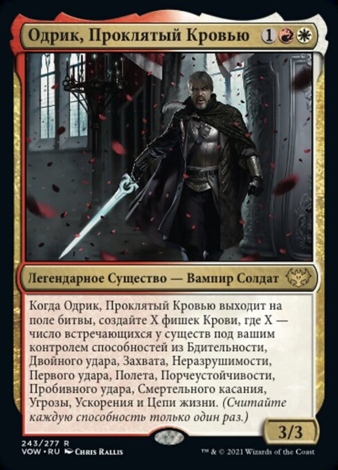 | Rules | When Odric, Blood-Cursed enters the battlefield, create X Blood tokens, where X is the number of abilities from among flying, first strike, double strike, deathtouch, haste, hexproof, indestructible, lifelink, menace, reach, trample, and vigilance found among creatures you control. (Count each ability only once.) |