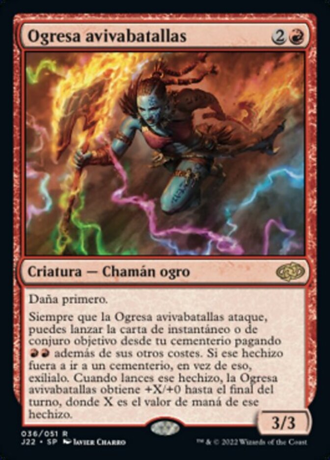 | Rules | First strike Whenever Ogre Battlecaster attacks, you may cast target instant or sorcery card from your graveyard by paying in addition to its other costs. If that spell would be put into a graveyard, exile it instead. When you cast that spell, Ogre Battlecaster gets +X/+0 until end of turn, where X is that spell's mana value. |