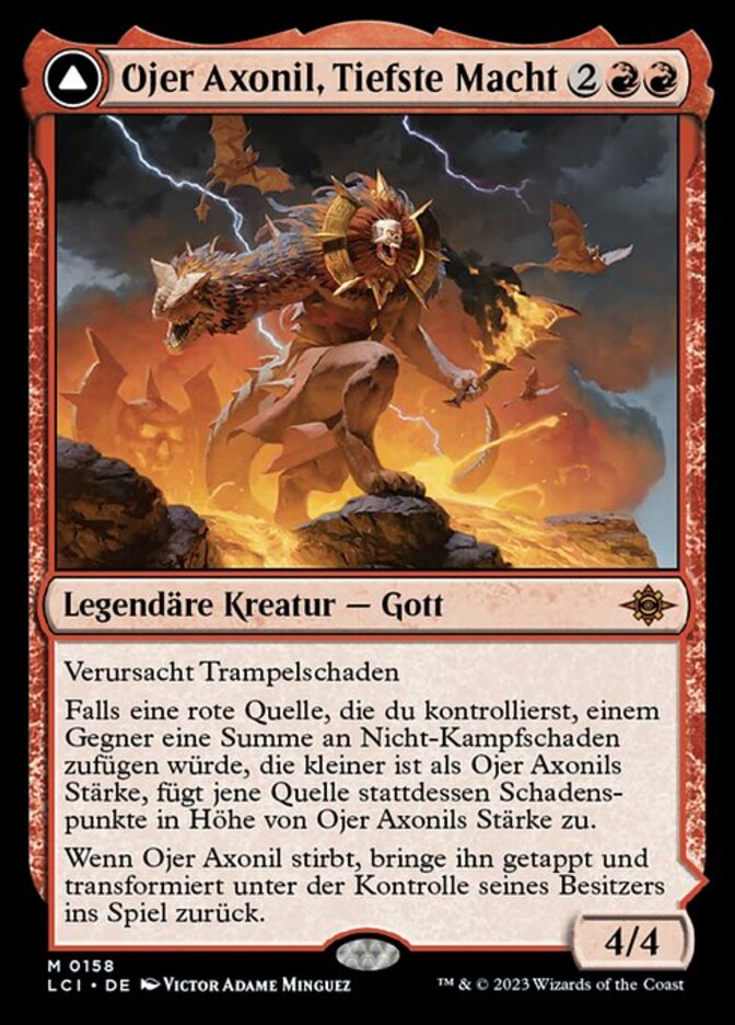 | Rules | Trample If a red source you control would deal an amount of noncombat damage less than Ojer Axonil's power to an opponent, that source deals damage equal to Ojer Axonil's power instead. When Ojer Axonil dies, return it to the battlefield tapped and transformed under its owner's control. // (Transforms from Ojer Axonil, Deepest Might.) : Add . , : Transform Temple of Power. Activate only if red sources you controlled dealt 4 or more noncombat damage this turn and only as a sorcery. |