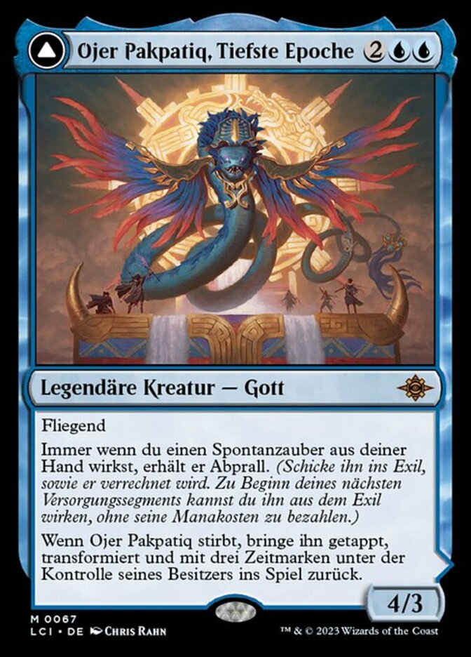 | Rules | Flying Whenever you cast an instant spell from your hand, it gains rebound. (Exile it as it resolves. At the beginning of your next upkeep, you may cast it from exile without paying its mana cost.) When Ojer Pakpatiq dies, return it to the battlefield tapped and transformed under its owner's control with three time counters on it. // (Transforms from Ojer Pakpatiq, Deepest Epoch.) : Add . Remove a time counter from Temple of Cyclical Time. , : Transform Temple of Cyclical Time. Activate only if it has no time counters on it and only as a sorcery. |