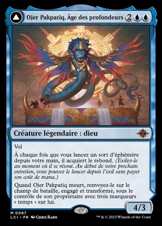 | Rules | Flying Whenever you cast an instant spell from your hand, it gains rebound. (Exile it as it resolves. At the beginning of your next upkeep, you may cast it from exile without paying its mana cost.) When Ojer Pakpatiq dies, return it to the battlefield tapped and transformed under its owner's control with three time counters on it. // (Transforms from Ojer Pakpatiq, Deepest Epoch.) : Add . Remove a time counter from Temple of Cyclical Time. , : Transform Temple of Cyclical Time. Activate only if it has no time counters on it and only as a sorcery. |