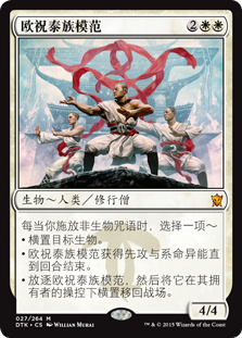 | Rules | Whenever you cast a noncreature spell, choose one — • Tap target creature. • Ojutai Exemplars gains first strike and lifelink until end of turn. • Exile Ojutai Exemplars, then return it to the battlefield tapped under its owner's control. |