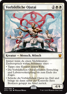 | Rules | Whenever you cast a noncreature spell, choose one — • Tap target creature. • Ojutai Exemplars gains first strike and lifelink until end of turn. • Exile Ojutai Exemplars, then return it to the battlefield tapped under its owner's control. |