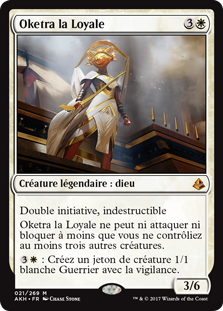 | Rules | Double strike, indestructible Oketra the True can't attack or block unless you control at least three other creatures. : Create a 1/1 white Warrior creature token with vigilance. |