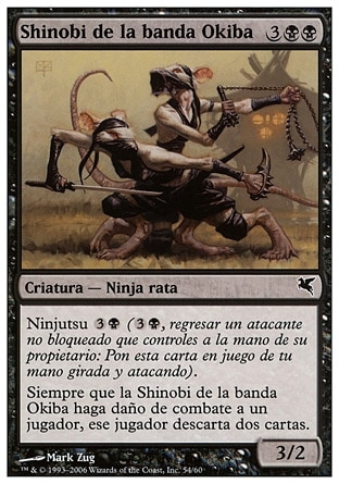 Whenever Okiba-Gang Shinobi deals combat damage to a player, that player discards two cards.