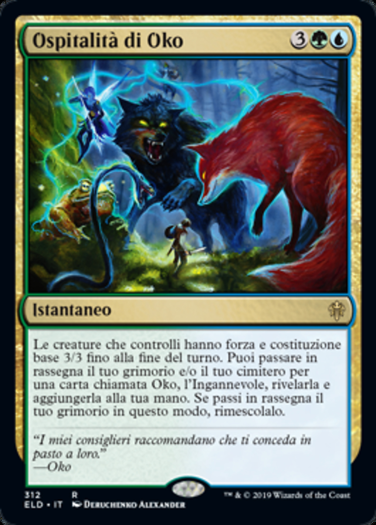 | Rules | Creatures you control have base power and toughness 3/3 until end of turn. You may search your library and/or graveyard for a card named Oko, the Trickster, reveal it, and put it into your hand. If you search your library this way, shuffle. |