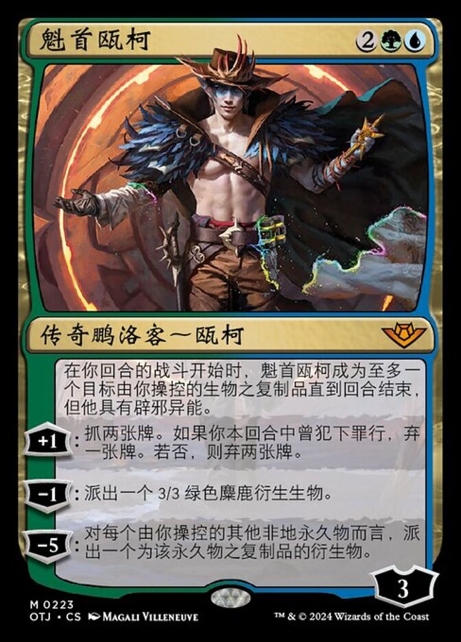 | Rules | At the beginning of combat on your turn, Oko, the Ringleader becomes a copy of up to one target creature you control until end of turn, except he has hexproof. +1: Draw two cards. If you've committed a crime this turn, discard a card. Otherwise, discard two cards. −1: Create a 3/3 green Elk creature token. −5: For each other nonland permanent you control, create a token that's a copy of that permanent. |