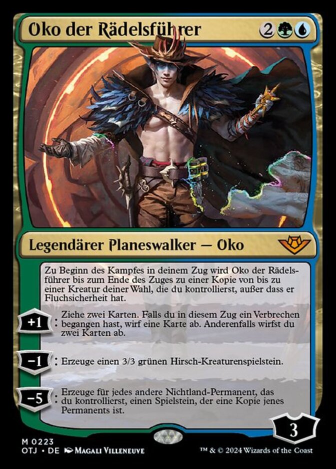 | Rules | At the beginning of combat on your turn, Oko, the Ringleader becomes a copy of up to one target creature you control until end of turn, except he has hexproof. +1: Draw two cards. If you've committed a crime this turn, discard a card. Otherwise, discard two cards. −1: Create a 3/3 green Elk creature token. −5: For each other nonland permanent you control, create a token that's a copy of that permanent. |