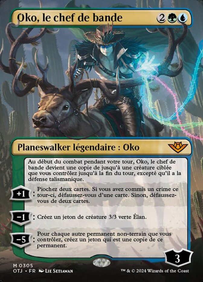 | Rules | At the beginning of combat on your turn, Oko, the Ringleader becomes a copy of up to one target creature you control until end of turn, except he has hexproof. +1: Draw two cards. If you've committed a crime this turn, discard a card. Otherwise, discard two cards. −1: Create a 3/3 green Elk creature token. −5: For each other nonland permanent you control, create a token that's a copy of that permanent. |