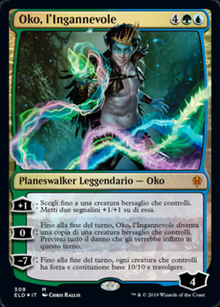 | Rules | +1: Put two +1/+1 counters on up to one target creature you control. 0: Until end of turn, Oko, the Trickster becomes a copy of target creature you control. Prevent all damage that would be dealt to him this turn. −7: Until end of turn, each creature you control has base power and toughness 10/10 and gains trample. |