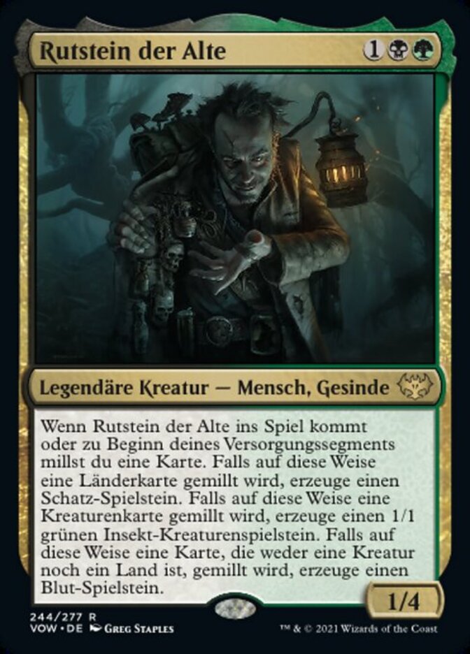 | Rules | When Old Rutstein enters the battlefield or at the beginning of your upkeep, mill a card. If a land card is milled this way, create a Treasure token. If a creature card is milled this way, create a 1/1 green Insect creature token. If a noncreature, nonland card is milled this way, create a Blood token. |