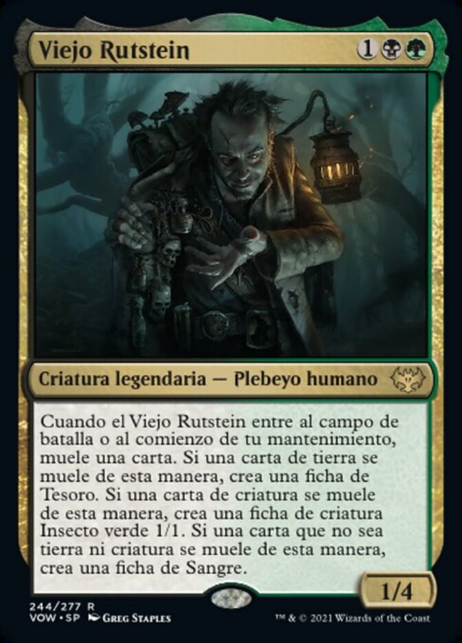| Rules | When Old Rutstein enters the battlefield or at the beginning of your upkeep, mill a card. If a land card is milled this way, create a Treasure token. If a creature card is milled this way, create a 1/1 green Insect creature token. If a noncreature, nonland card is milled this way, create a Blood token. |