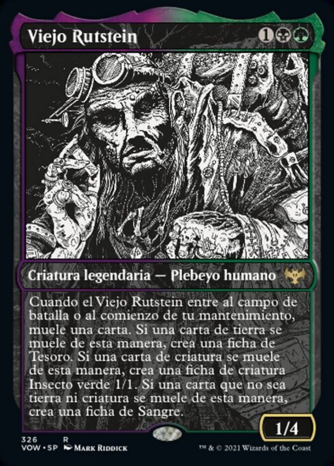 | Rules | When Old Rutstein enters the battlefield or at the beginning of your upkeep, mill a card. If a land card is milled this way, create a Treasure token. If a creature card is milled this way, create a 1/1 green Insect creature token. If a noncreature, nonland card is milled this way, create a Blood token. |