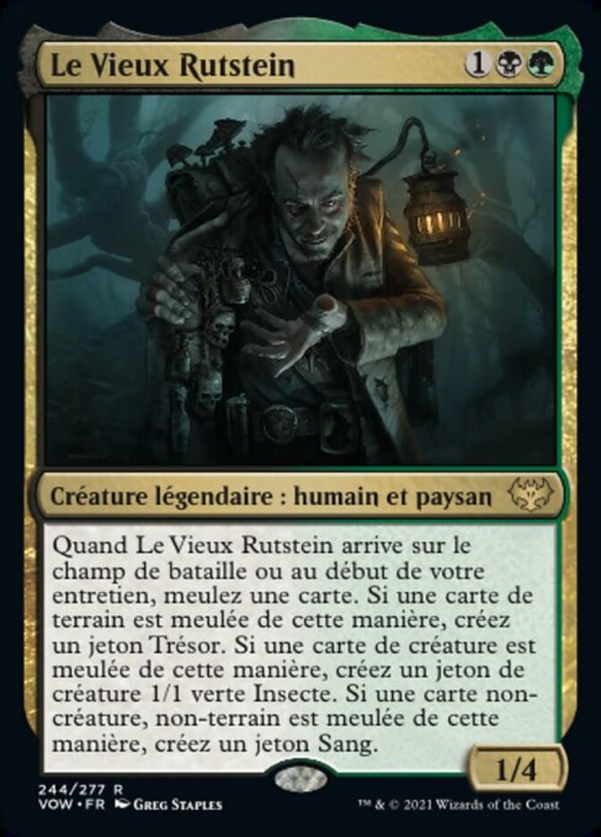 | Rules | When Old Rutstein enters the battlefield or at the beginning of your upkeep, mill a card. If a land card is milled this way, create a Treasure token. If a creature card is milled this way, create a 1/1 green Insect creature token. If a noncreature, nonland card is milled this way, create a Blood token. |