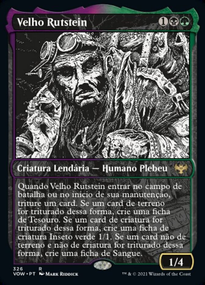 | Rules | When Old Rutstein enters the battlefield or at the beginning of your upkeep, mill a card. If a land card is milled this way, create a Treasure token. If a creature card is milled this way, create a 1/1 green Insect creature token. If a noncreature, nonland card is milled this way, create a Blood token. |