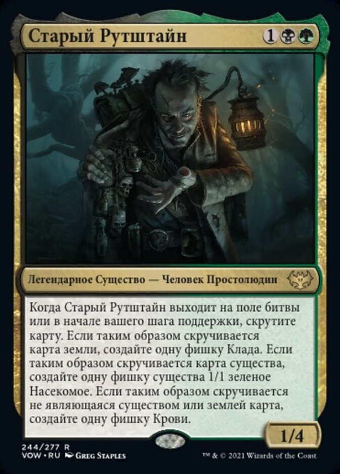 | Rules | When Old Rutstein enters the battlefield or at the beginning of your upkeep, mill a card. If a land card is milled this way, create a Treasure token. If a creature card is milled this way, create a 1/1 green Insect creature token. If a noncreature, nonland card is milled this way, create a Blood token. |