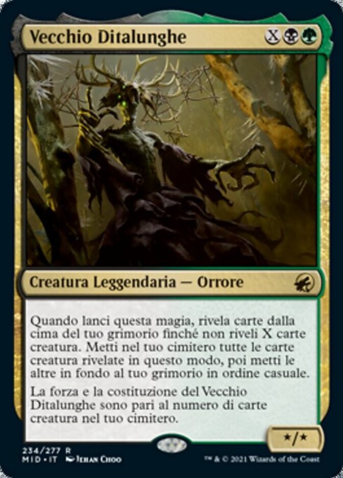 | Rules | When you cast this spell, reveal cards from the top of your library until you reveal X creature cards. Put all creature cards revealed this way into your graveyard, then put the rest on the bottom of your library in a random order. Old Stickfingers's power and toughness are each equal to the number of creature cards in your graveyard. |
