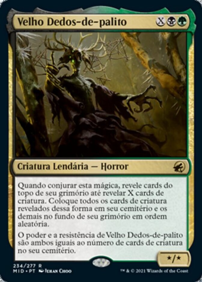 | Rules | When you cast this spell, reveal cards from the top of your library until you reveal X creature cards. Put all creature cards revealed this way into your graveyard, then put the rest on the bottom of your library in a random order. Old Stickfingers's power and toughness are each equal to the number of creature cards in your graveyard. |
