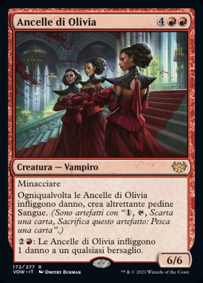 | Rules | Menace Whenever Olivia's Attendants deals damage, create that many Blood tokens. (They're artifacts with ", , Discard a card, Sacrifice this artifact: Draw a card.") : Olivia's Attendants deals 1 damage to any target. |