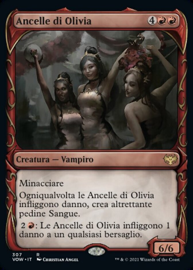 | Rules | Menace Whenever Olivia's Attendants deals damage, create that many Blood tokens. (They're artifacts with ", , Discard a card, Sacrifice this artifact: Draw a card.") : Olivia's Attendants deals 1 damage to any target. |