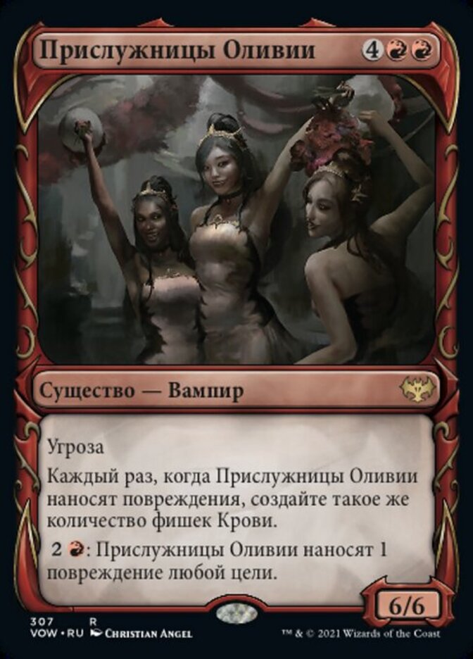| Rules | Menace Whenever Olivia's Attendants deals damage, create that many Blood tokens. (They're artifacts with ", , Discard a card, Sacrifice this artifact: Draw a card.") : Olivia's Attendants deals 1 damage to any target. |