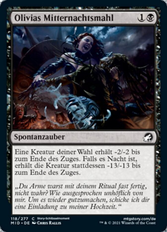 | Rules | Target creature gets -2/-2 until end of turn. If it's night, that creature gets -13/-13 until end of turn instead. |