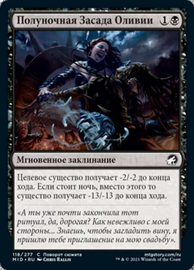 | Rules | Target creature gets -2/-2 until end of turn. If it's night, that creature gets -13/-13 until end of turn instead. |