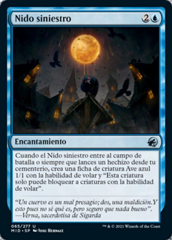 | Rules | When Ominous Roost enters the battlefield or whenever you cast a spell from your graveyard, create a 1/1 blue Bird creature token with flying and "This creature can block only creatures with flying." |