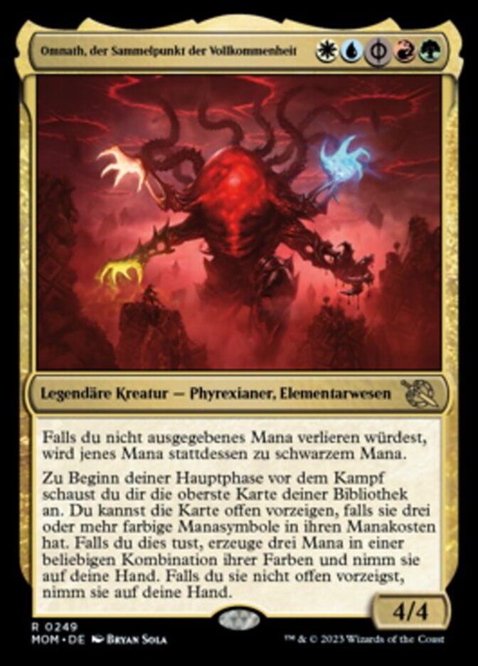 | Rules | If you would lose unspent mana, that mana becomes black instead. At the beginning of your precombat main phase, look at the top card of your library. You may reveal that card if it has three or more colored mana symbols in its mana cost. If you do, add three mana in any combination of its colors and put it into your hand. If you don't reveal it, put it into your hand. |