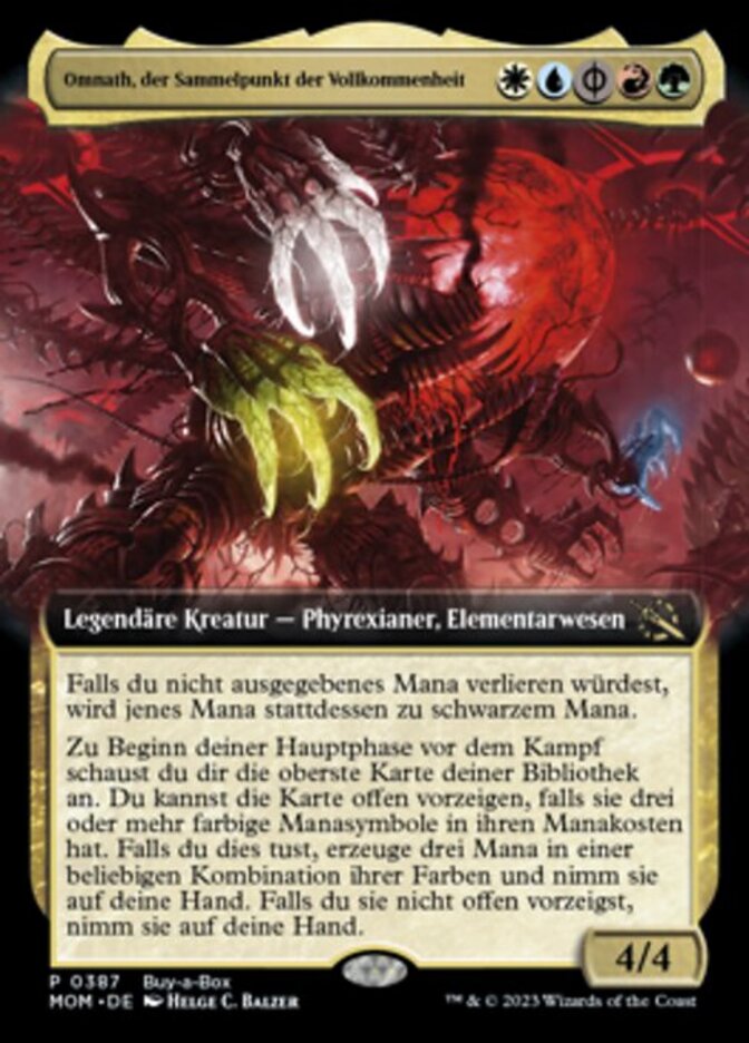 | Rules | If you would lose unspent mana, that mana becomes black instead. At the beginning of your precombat main phase, look at the top card of your library. You may reveal that card if it has three or more colored mana symbols in its mana cost. If you do, add three mana in any combination of its colors and put it into your hand. If you don't reveal it, put it into your hand. |