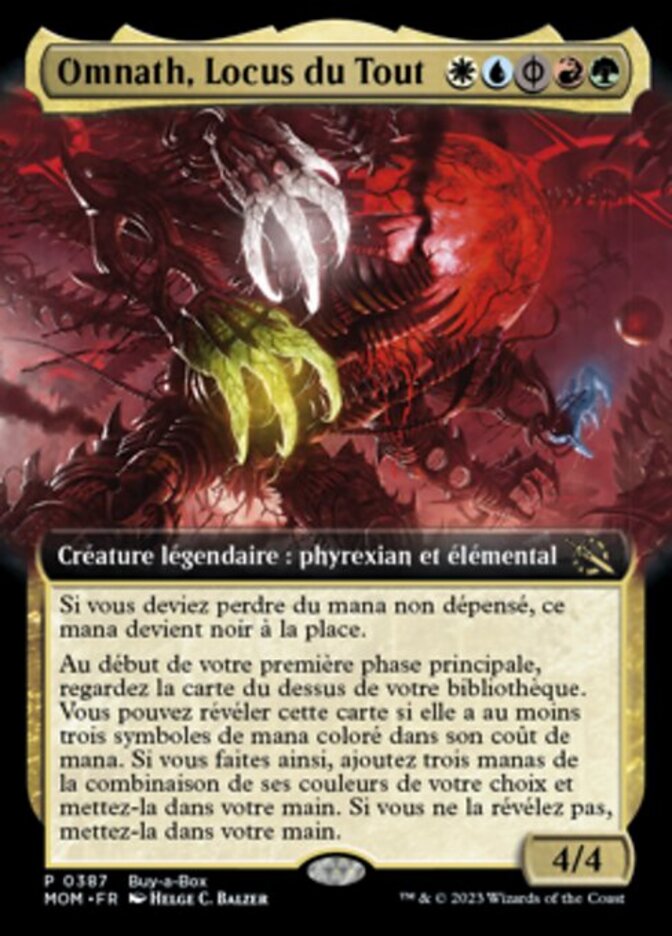 | Rules | If you would lose unspent mana, that mana becomes black instead. At the beginning of your precombat main phase, look at the top card of your library. You may reveal that card if it has three or more colored mana symbols in its mana cost. If you do, add three mana in any combination of its colors and put it into your hand. If you don't reveal it, put it into your hand. |